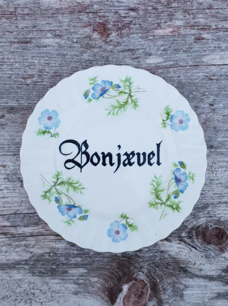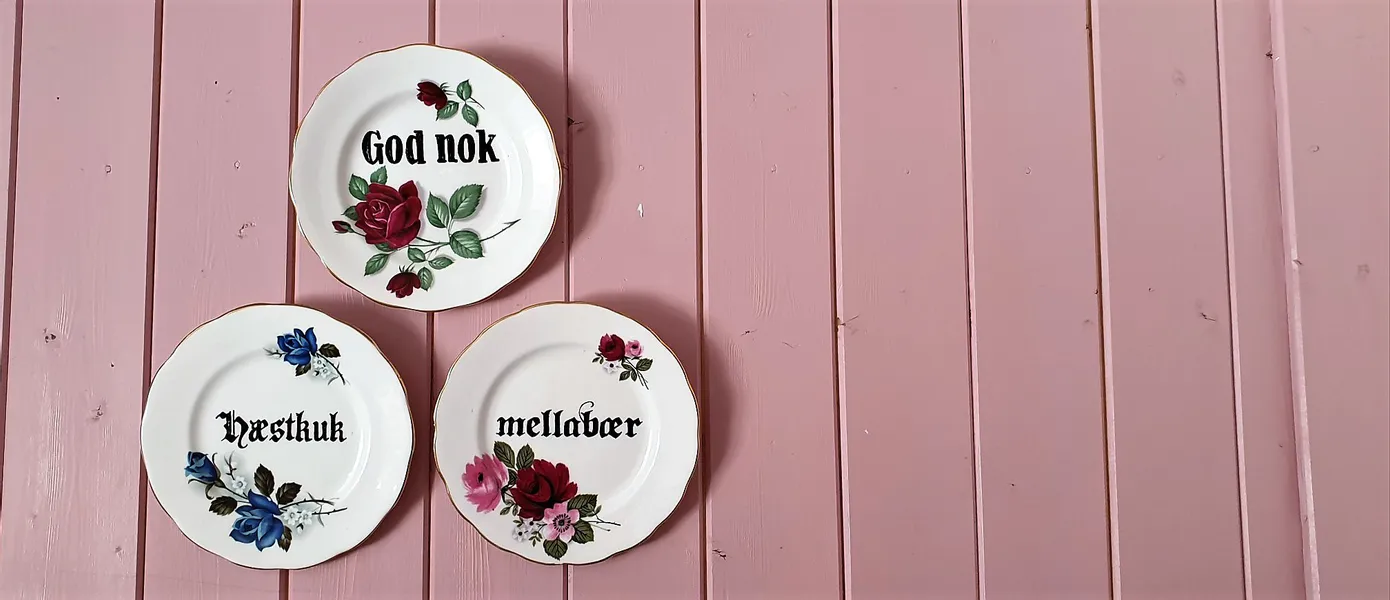 Hvit emaljekopp med sort kant, ord og uttrykk fra Nordnorge i rosalilla,...